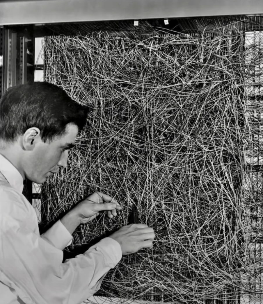 Today, I'm starting to work on the 4th edition of the fastai course, and I'll be note-taking on this blog. At the start Jeremy shows this lovely photo of the Mark 1 perceptron at Cornell circa 1961. It does a great job at showing the complexity of the connections in a neural network: