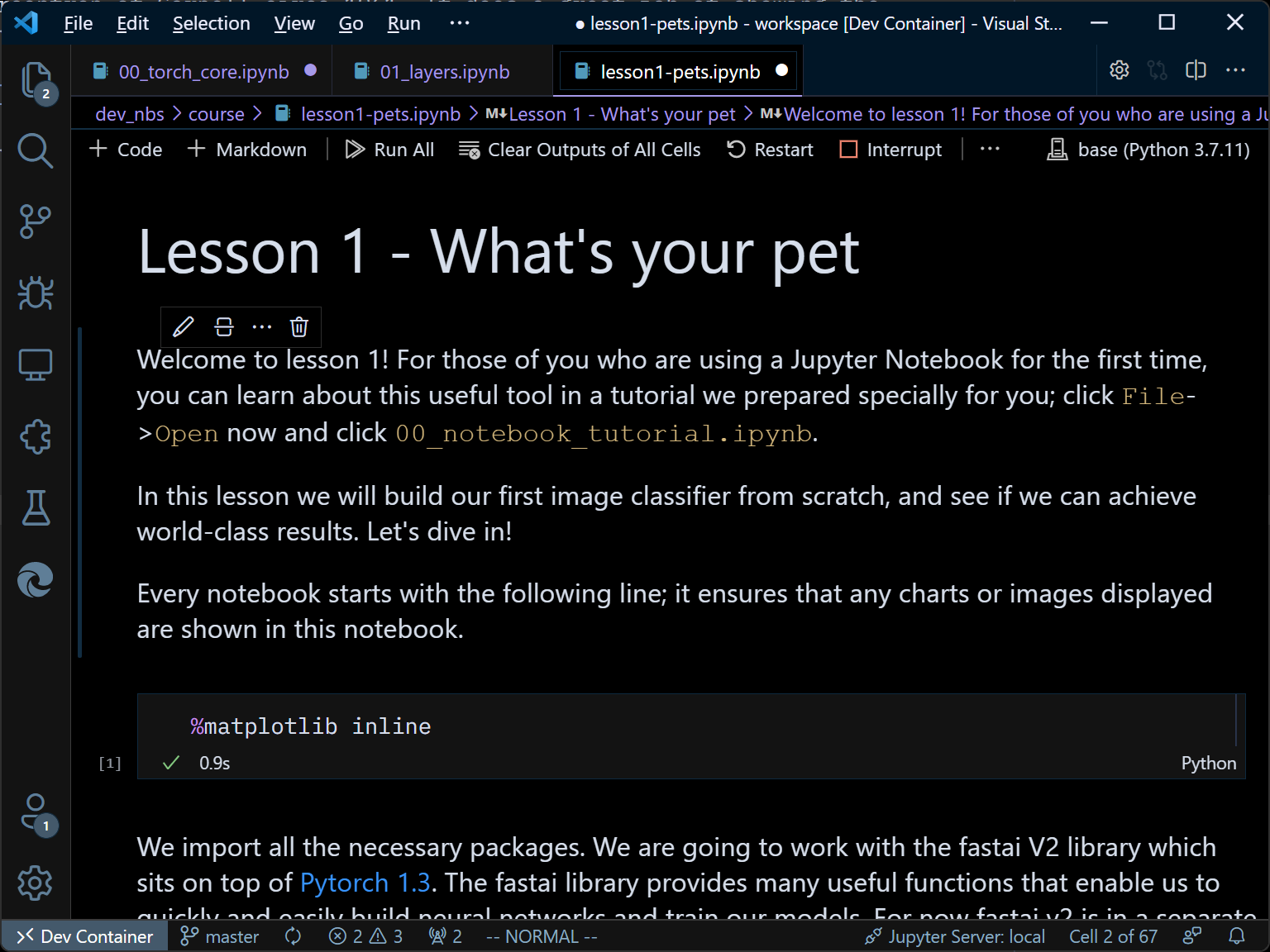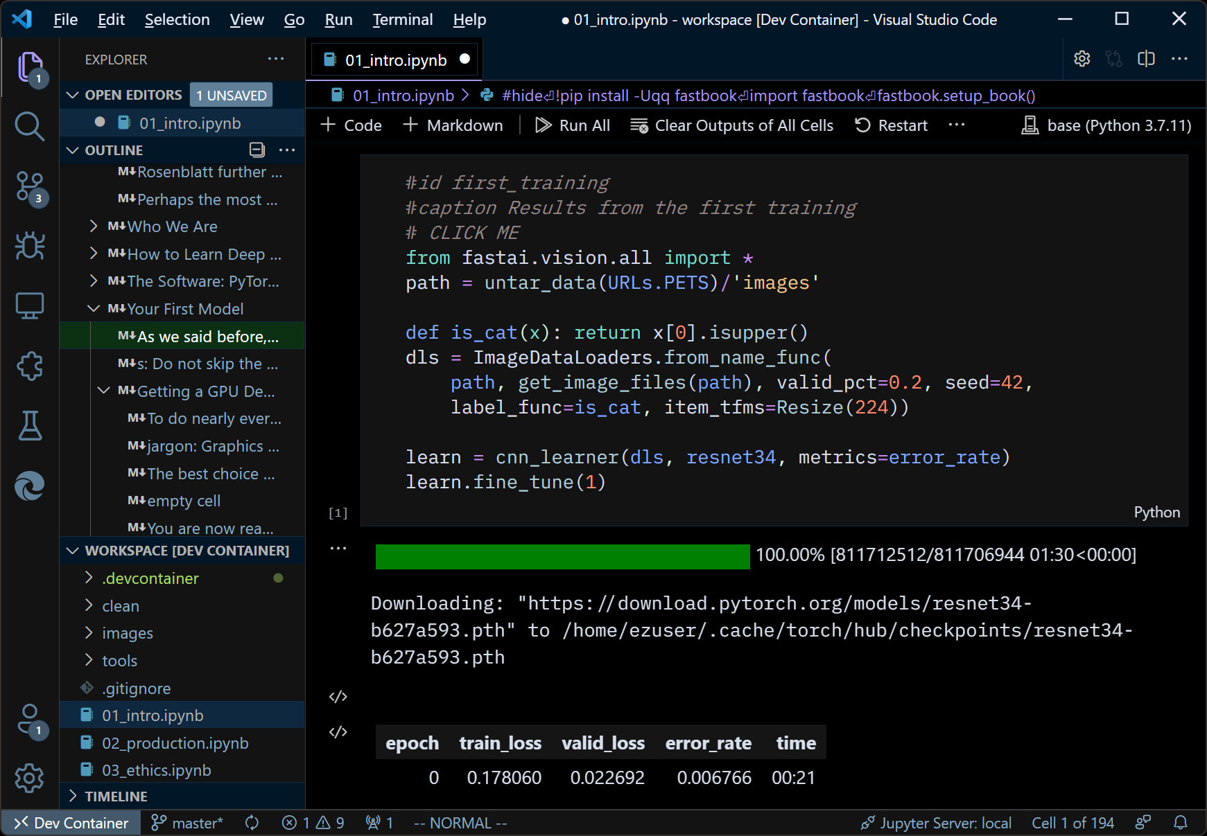 This is a screenshot from my computer this morning after running the first model in the course. You can see that I'm using the Outline feature in VS Code notebooks to see an outline of the different sections from the first chapter of the book: