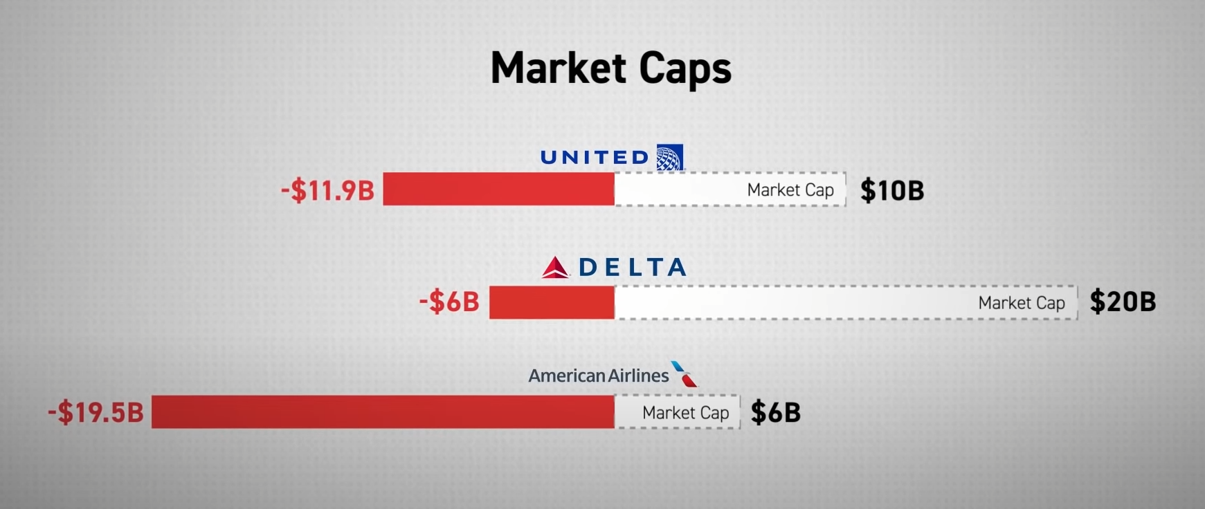 This diagram does a great job at explaining how Wall Street values airlines and their frequent flyer programs. Effectively operating an airline is a loss- leader for providing frequent flyer miles! Now, there's an arbitrary multiplier applied over EBITDA to come up with the valuation of the frequent flyer programs but this is still a stunning figure: